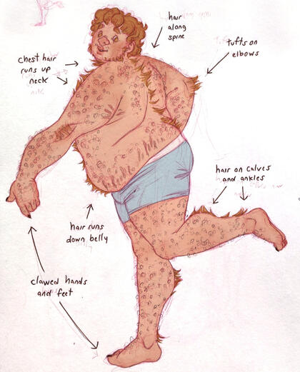 They also have tufts of hair on their jaw, chest, elbows, and calves. This is true no matter the werewolves gender, though young werewolves may have less hair.